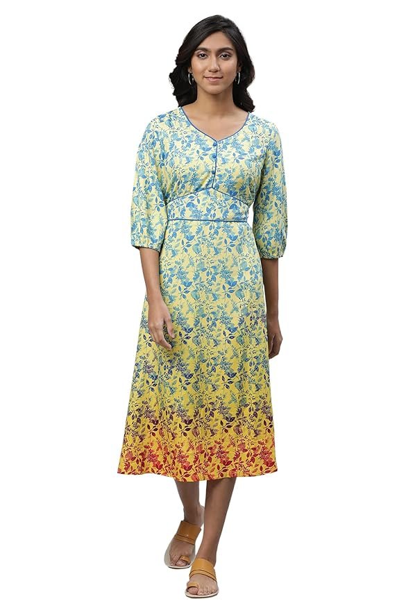 • This yellow A-line midi dress from Aurelia is a perfect casual wear option. Made from 100% polyester, it features a V-neckline and three-quarter sleeves. The leaf print design adds a refreshing touch to this western-inspired piece.