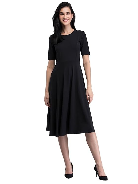 FableStreet Cotton Round Neck Knitted Fit and Flare Dress – Black