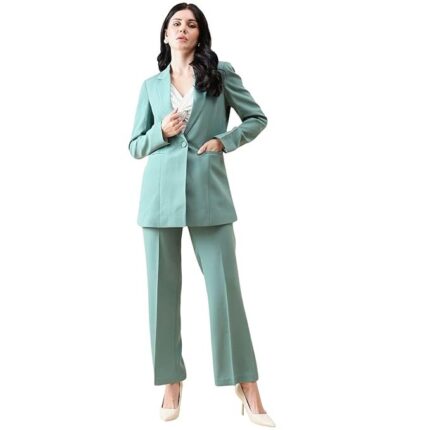 Powersutra Women’s Sage Green Notch Collar Stretch Suit with Blazer & Trousers | Single-Breasted | Button Closure | Elastic Waist Pants