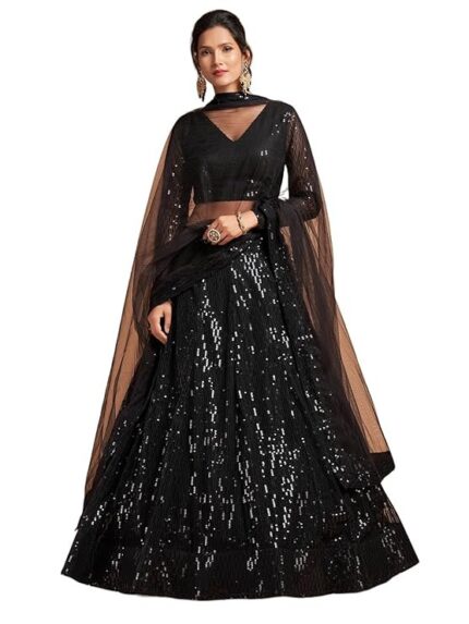 Zeel Clothing Women’s Black Soft Net Sequins Embroidered Semi-Stitched New Lehenga Choli with Dupatta